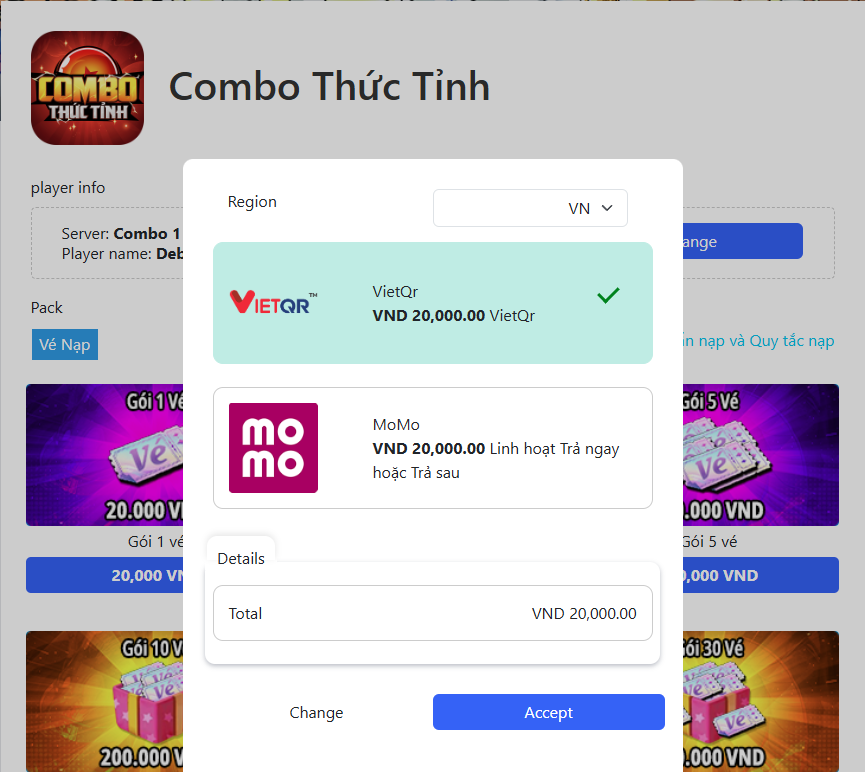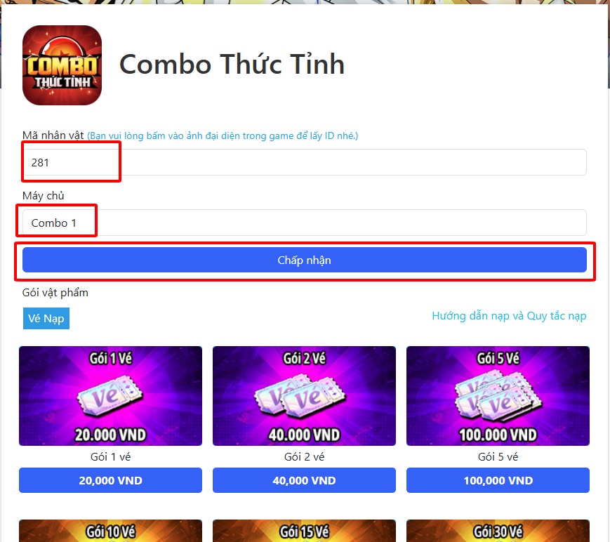 - Bước 3: Sau khi bấm chấp nhận sẽ hiển thị thông tin người chơi lúc này có thể chọn Gói "Vé Nạp" cần nạp