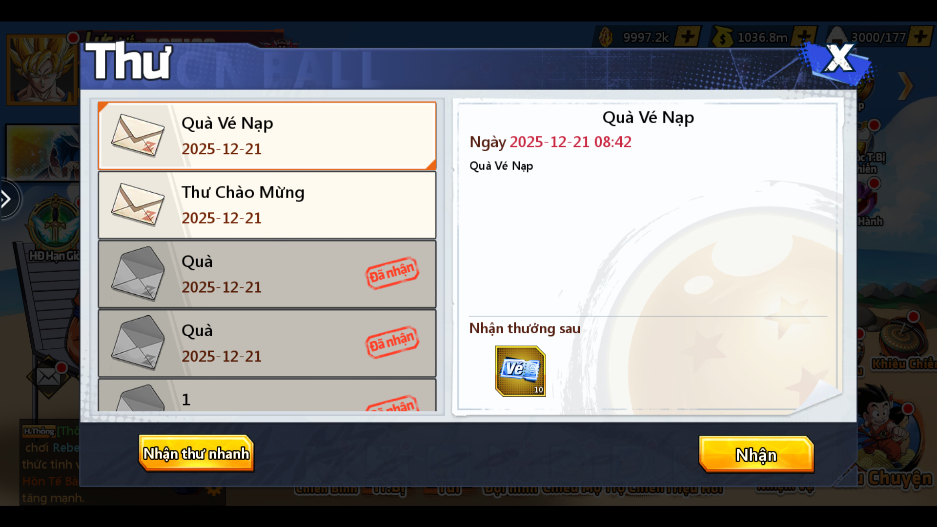 Bước 1: Nhận Vé Nạp từ thư hệ thống