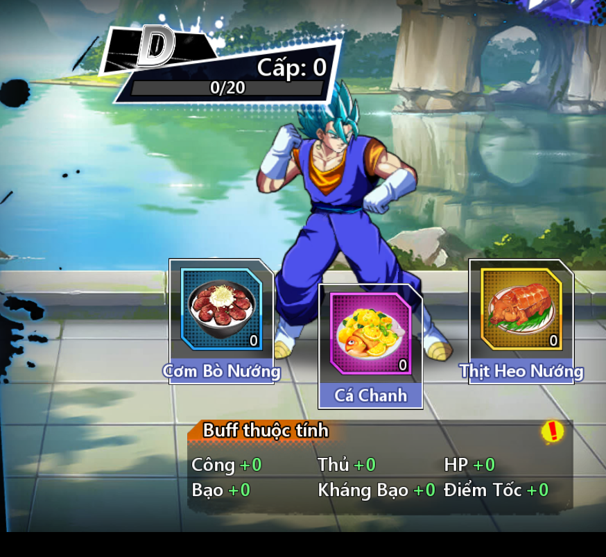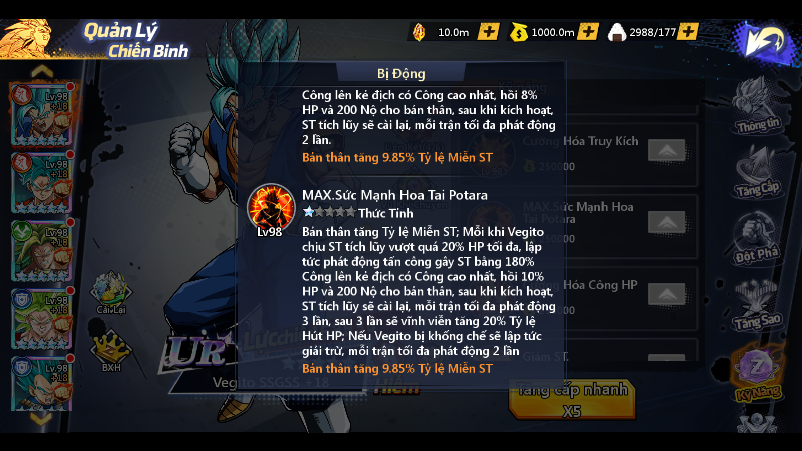 [Thể Thuật/Khí Công] Vegito tấn công 1 kẻ địch, gây thêm ST bằng 8% HP tối đa, mỗi lần Vegito tung kỹ năng nhỏ tăng vĩnh viễn 8% Công và Tỷ lệ kỹ năng nhỏ, được cộng dồn 3 lần, 60% tỷ lệ gây [Hất Tung Nhẹ]